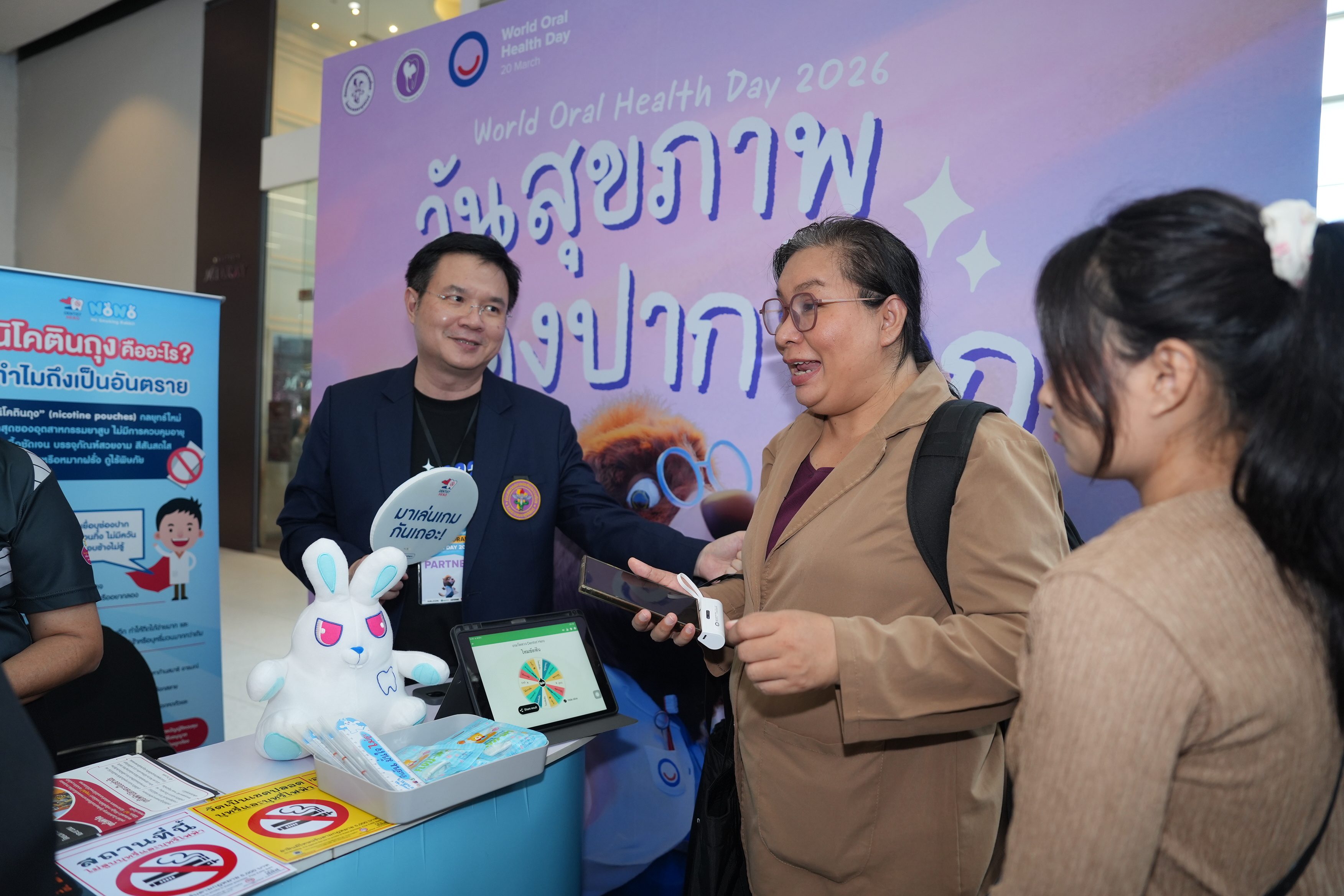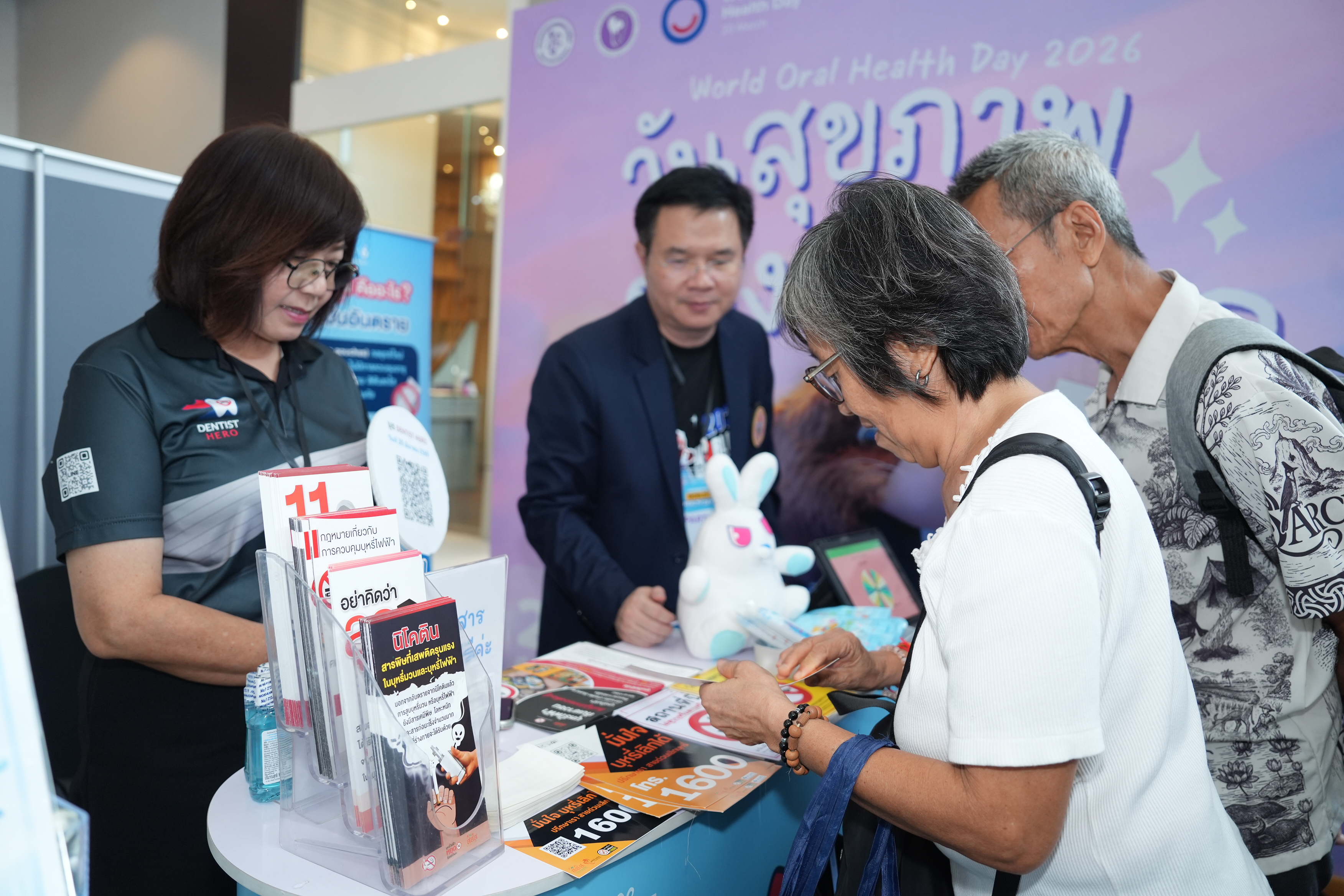 เมื่อวันที่ 20 มี.ค. 69 Dentist Hero และโครงการทันตบุคลากรไทยเพื่อการควบคุมยาสูบและบุหรี่ไฟฟ้า ร่วมจัดบูธกิจกรรมในงานวันสุขภาพช่องปากโลก (World Oral Health Day) 2026 จัดโดย ทันตแพทยสมาคมแห่งประเทศไทย ในพระบรมราชูปถัมภ์ ร่วมกับ สมาพันธ์นิสิตนักศึกษาทันตแพทย์แห่งประเทศไทย (สนทท.) และภาคีเครือข่ายด้านทันตสุขภาพ โดยมี ผศ.ดร.ทันตแพทย์สุธี สุขสุเดช ประธานคณะทำงานแผนงานย่อย ชุดที่ 3 พัฒนาเครือข่ายทันตแพทย์ภาคเอกชนในการควบคุมยาสูบ ร่วมให้ความรู้กับผู้ร่วมกิจกรรม ณ ลาน Eden ชั้น 3 CentralWorld